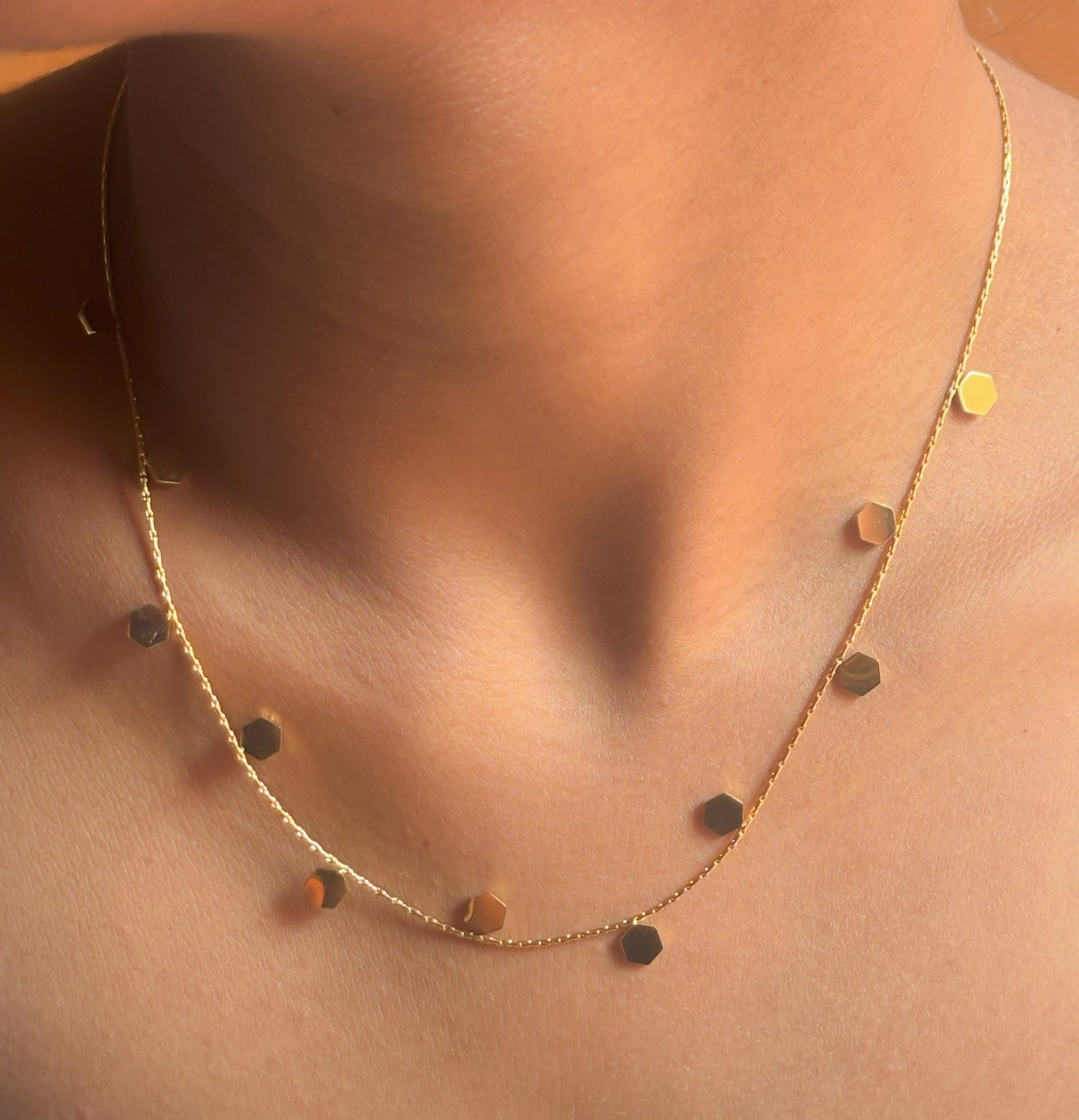 Delicately crafted with golden hexagon charms, Hexa Gleam adds a modern sparkle to your look.